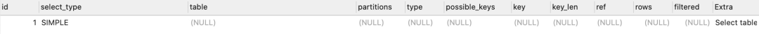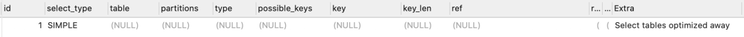 代表查询在mysql能够在优化阶段分解查询语句的时候直接能完成,不需要查询表和索引,例如获取逐渐最大列或最小列: