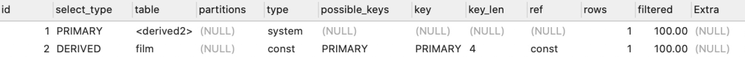 explain select (select 1 from actor where id = 1) from (select * from film where id = 1) der;