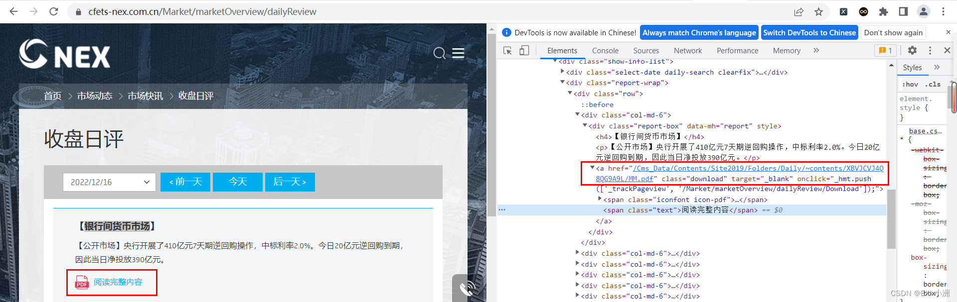 标签a的href:/Cms_Data/Contents/Site2019/Folders/Daily/~contents/XBVJCVJ4Q8QG9A9L/MM.pdf 根据经验前缀需要加上:https://www.cfets-nex.com.cn 组合后可以直接打开PDF:https://www.cfets-nex.com.cn/Cms_Data/Contents/Site2019/Folders/Daily/~contents/XBVJCVJ4Q8QG9A9L/MM.pdf