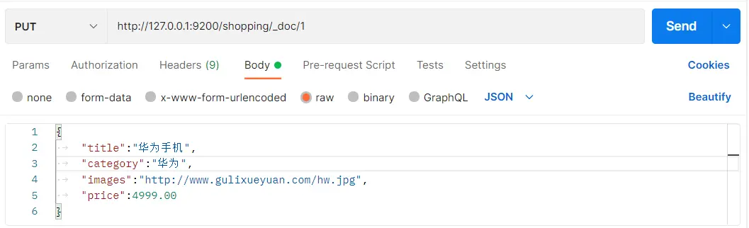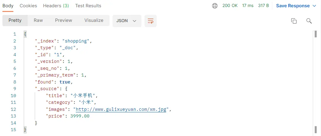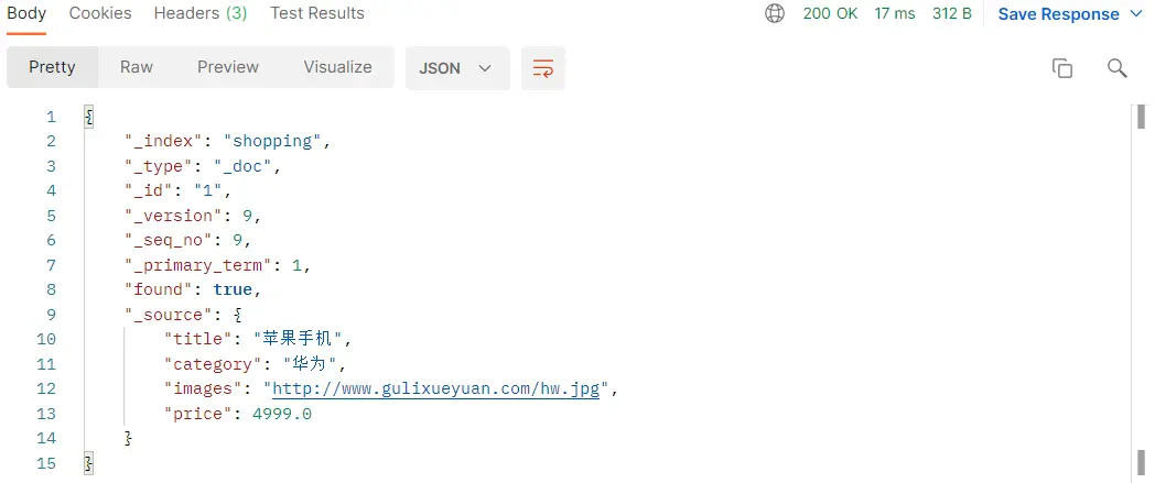 请求 :http://127.0.0.1:9200/shopping/_doc/1