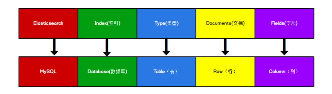 Elasticsearch 是面向文档型数据库,一条数据在这里就是一个文档。为了方便大家理解,我们将 Elasticsearch 里存储文档数据和关系型数据库 MySQL 存储数据的概念进行一个类比ES 里的 Index 可以看做一个库,而 Types 相当于表,Documents 则相当于表的行。