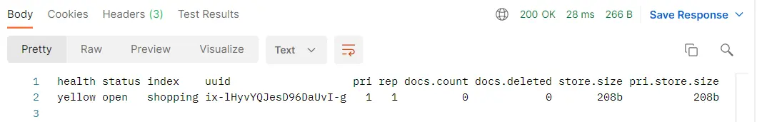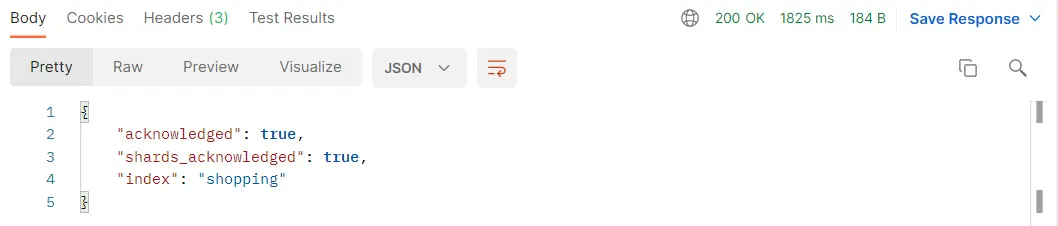 查看索引向 ES 服务器发送的请求路径和创建索引是一致的。但是 HTTP 方法不一致。这里可以体会一下 RESTful 的意义,请求后,服务器响应结果如下:
