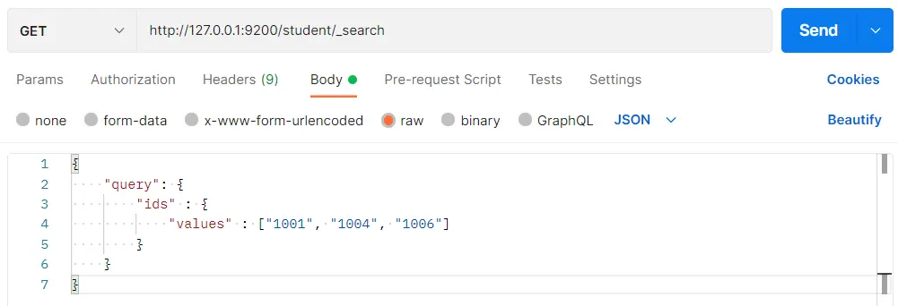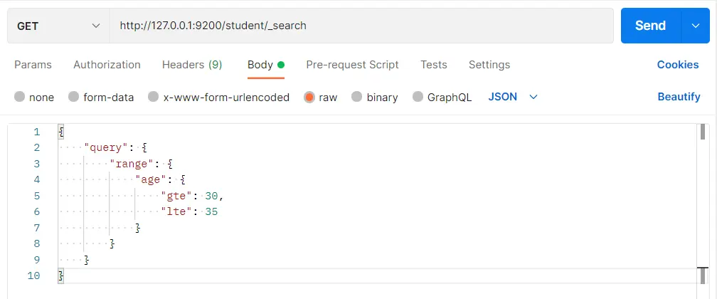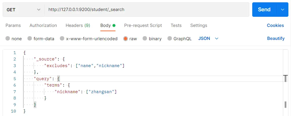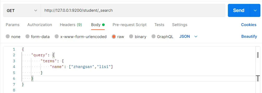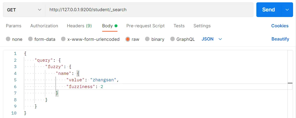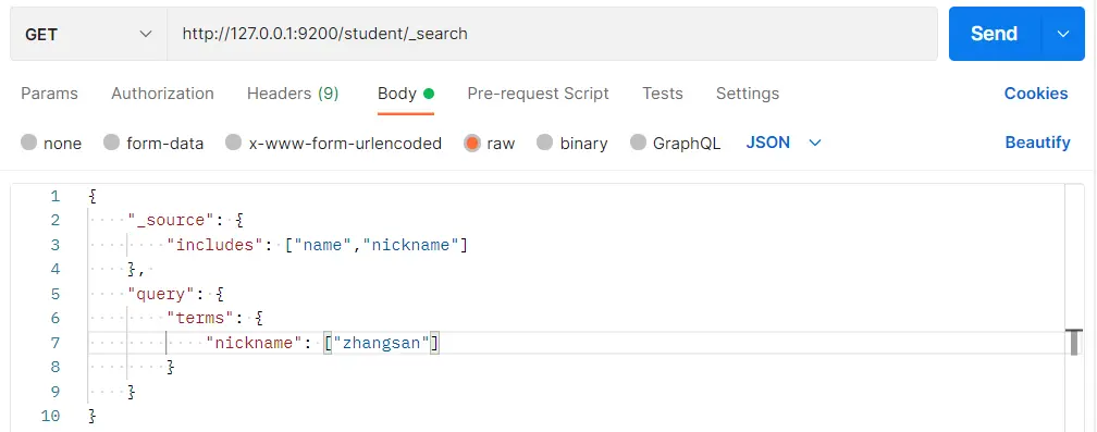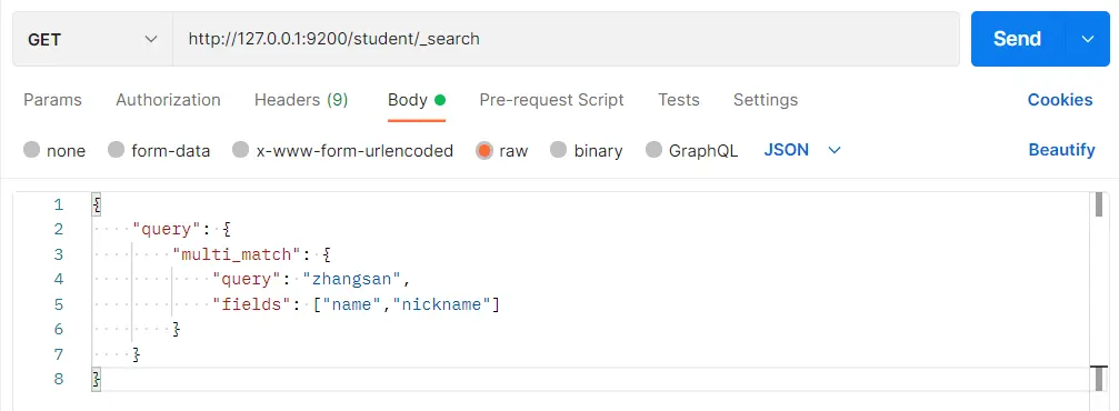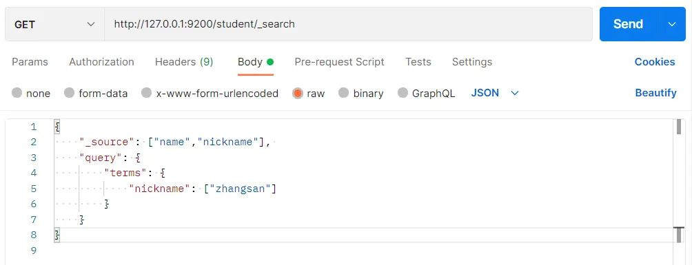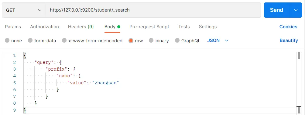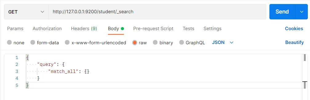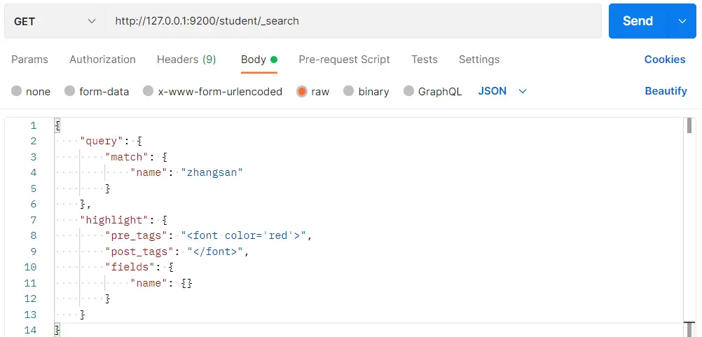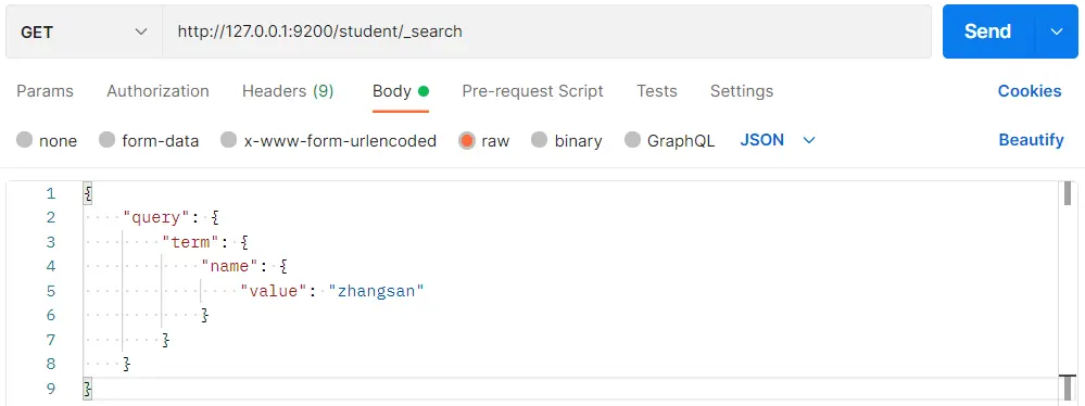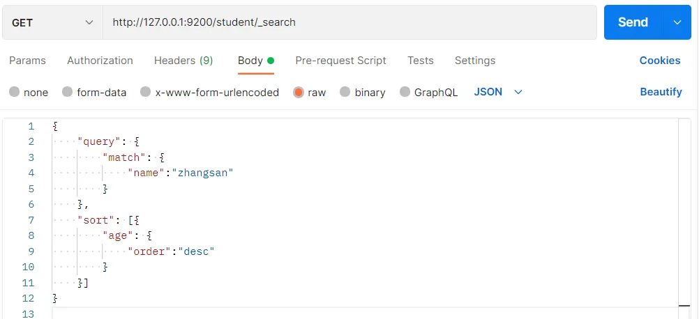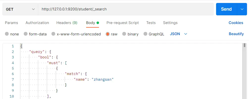 }在 Postman 中,向 ES 服务器发 GET 请求:http://127.0.0.1:9200/student/_search