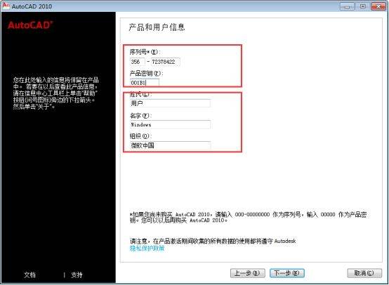6、下面部分随意填写,序列号输入356-72378422,产品密钥输入001B1,然后点击下一步