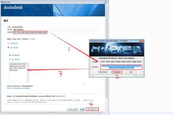 22、按如图所示步骤,先将申请号放在注册机的Request栏,点击注册机上面的Generate生产激活码,将激活码放在左边的激活码栏,最后点击下一步
