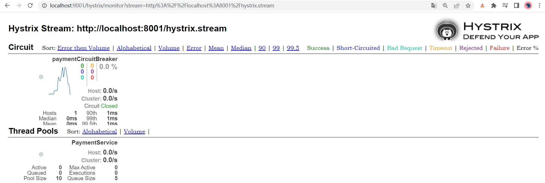 9001监控8001 - 填写监控地址 - http://localhost:8001/hystrix.stream 到 http://localhost:9001/hystrix页面的输入框。