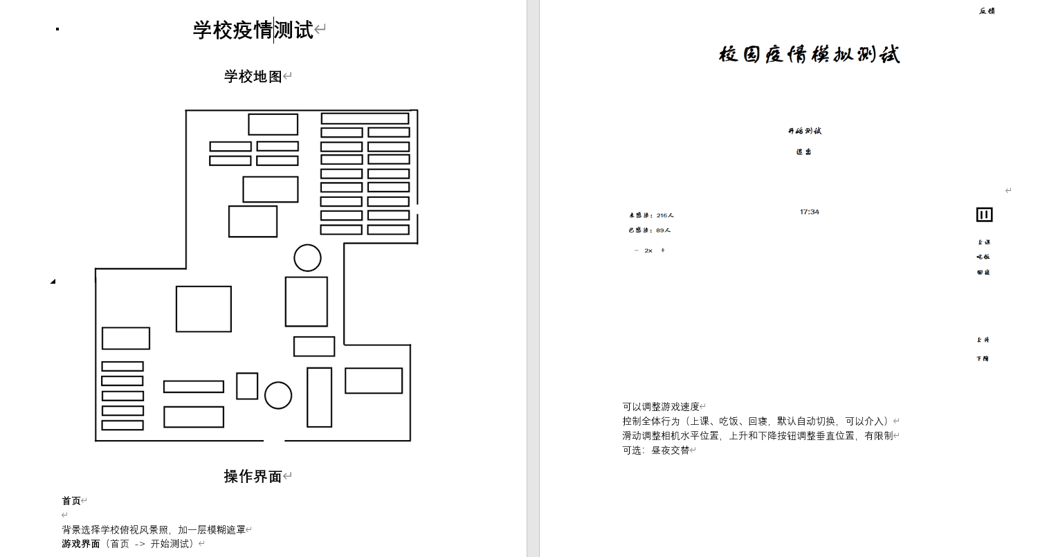 因为是做疫情模拟,数据量很大,所以其它方面要尽量抽象,突出重点也节省性能,所去找了张校园俯视图,然后绘制了一张抽象地图。 然后是功能,希望在开始模拟前,让一些参数给用户在相应范围内调整,例如学生总数,最初感染的人数,每次接触患者感染的几率,感染后多久后具备传染性,以及口罩类型,分为医用外科口罩、普通棉布口罩、医用防护口罩(N95),并查阅了这些口罩的防护效果,当计算是否感染时防护效果会用到。而有些参数需要用但不能给用户调整,例如碰撞传染检测频率、最小最大倍速、口罩减免效果、游戏时间与现实时间比例、管理行动的时间表等,给用户调整容易乱。还有游戏过程中需要能暂停和调整速度。 然后是UI,分为主界面、测试参数填写,游戏界面和暂停界面。UI和背景配色尽量简约,不是游戏整的太花就很怪,为了适应不同的手机屏幕,还需要给不同的UI设置相应的对齐方式。