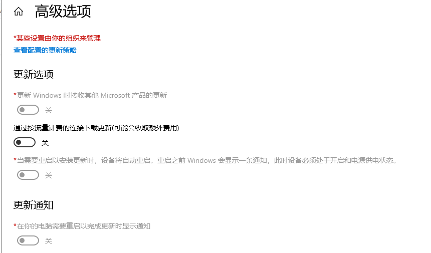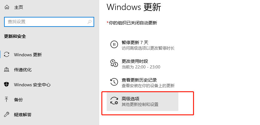在“windows更新”页面中找到“高级选项”,然后关闭这个页面中更新选项下属的所有开关。