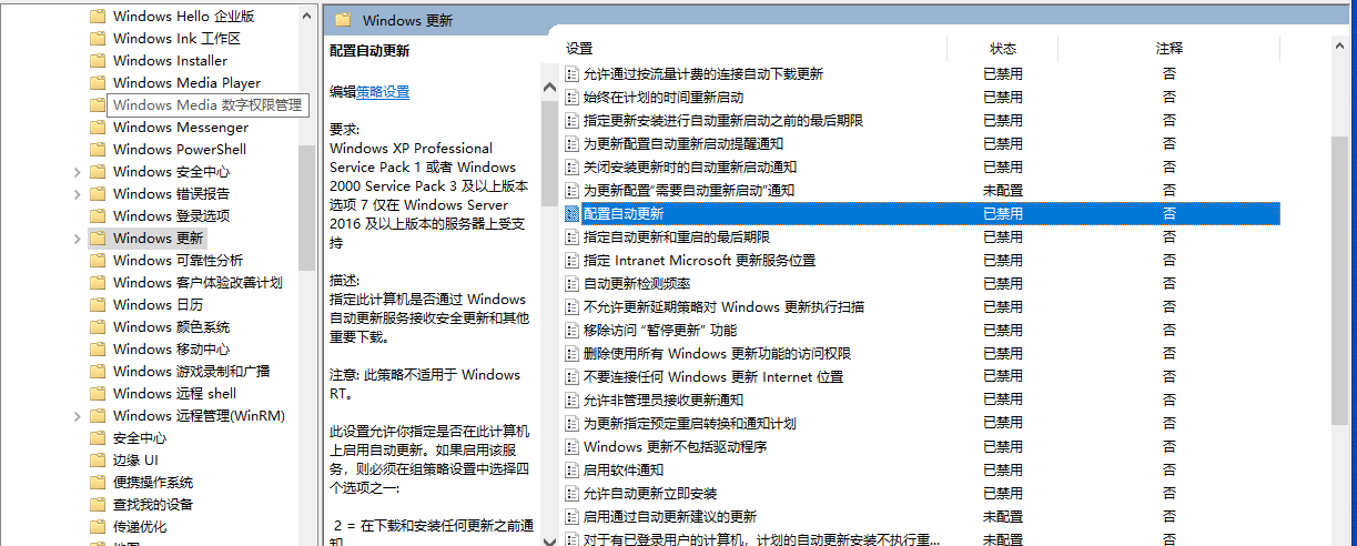 展开【计算机配置 -> 管理模板 -> Windows组件 -> Windows更新】,将所有的属性全部改为已禁用状态。