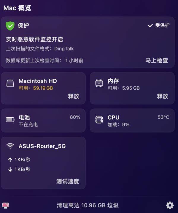 开启CleanMyMac X后,我们可以在顶部菜单栏中打开小窗口,它被命名为“Mac概览”,从中我们查看有关于Mac的各项详细信息,包括磁盘可用空间、占用内存的项目、电池续航与循环次数、CPU负载等等,让我们快速了解Mac的状态。
