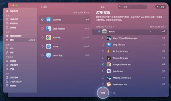 macOS的一些操作逻辑与iOS类似,在首次开启应用时,系统会提示我们“应用需要获取XX权限”,而CleanMyMac X能够将所有的应用权限进行整合,帮助我们了解到哪些应用被赋予了权限。如果我们不希望某款App被赋予权限,也可以直接通过CleanMyMac X实现关闭。例如我不希望Chrome浏览器使用我的麦克风,便可在CleanMyMac X中关闭权限。