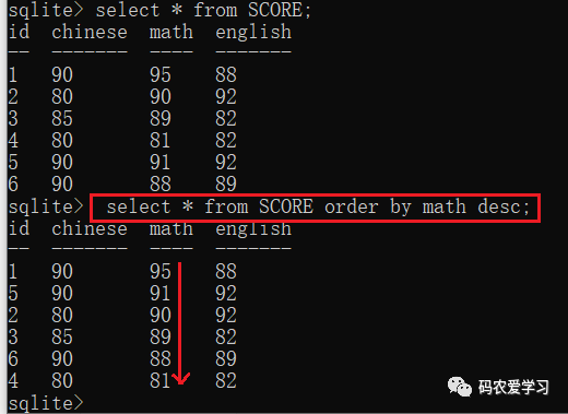 结果如下图所示,可以看出该指令使得所有数据按照math降序输出: