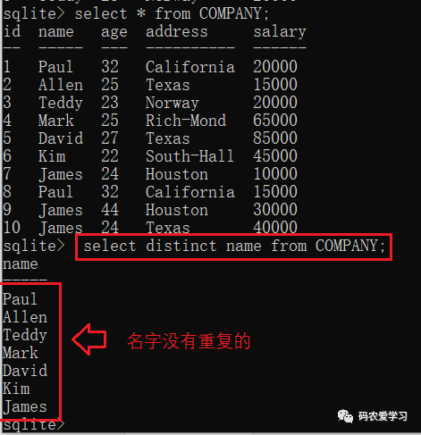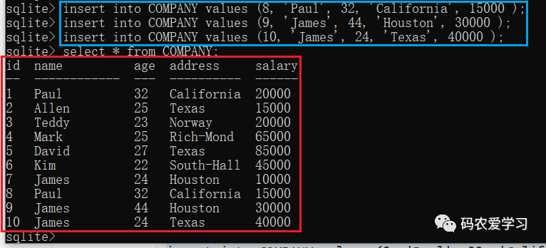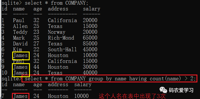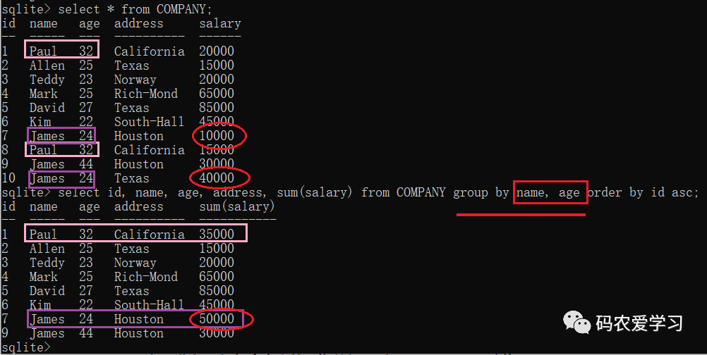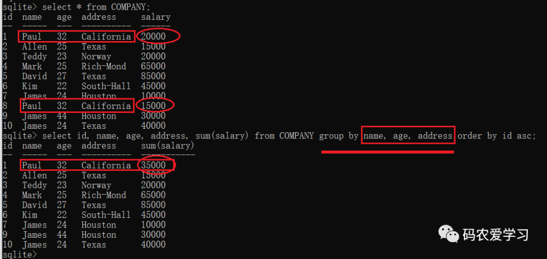 可以看出,输出了9条数据,因为id1和id8被合并了,这两条是同一个人(group by name, age, address的作用),输出的结果也通过sum语句输出了该职工的总工资3500(sum(salary)的作用),输出是按照id升序排序的(order by id asc的作用)。