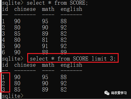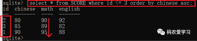 再比如将id前3的数据按照chinese成绩升序排序,就可以把condition条件加上,sql语句为: