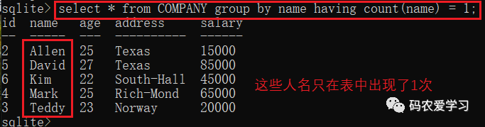 上面的group by子句可以对数据进行分组,那可不可以对分组的数据进一步筛选呢?比如,只想列出name计数为1的人名(没有重名的人)