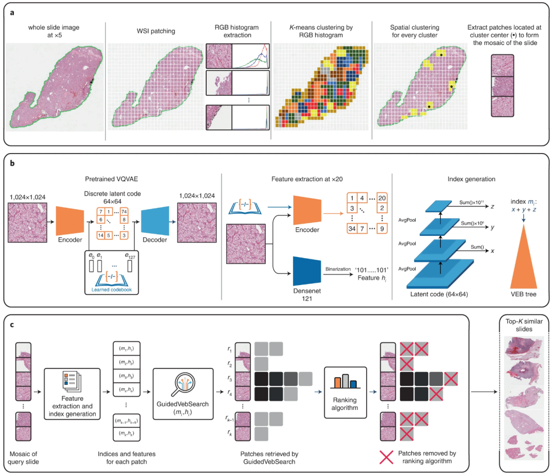 数字病理学的采用使得管理数十亿像素全切片病理图像(WSIs)的大型存储库成为可能。在不需要监督训练的情况下,在大型存储库中计算识别具有相似形态特征的WSIs具有重要的应用价值。然而,搜索相似WSIs的算法的检索速度往往与资源库的大小成正比,这限制了它们的临床和研究潜力。本文展示了可以利用自监督深度学习以独立于存储库大小的速度搜索和检索WSIs。作者将该算法命名为SISH(用于自我监督的组织学图像搜索),并作为一个开源包提供,它只需要用于训练的图像级注释,将WSIs编码为有意义的离散潜在表示,并利用树数据结构进行快速搜索,然后使用基于不确定性的排序算法进行WSI检索。作者在多个任务(包括基于组织补丁查询的检索任务)和超过22,000例患者病例和56种疾病亚型的数据集上评估SISH。SISH还可以用于帮助罕见癌症类型的诊断,对于这些癌症类型,可用的WSIs数量往往不足以训练有监督的深度学习模型。