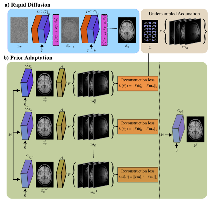 深度 MRI 重建通常使用条件模型执行,该模型对欠采样进行去混叠处理,以恢复与全采样数据一致的图像。由于条件模型是根据成像的知识进行训练的,因此它们的泛化能力可能很差。无条件模型改为学习与成像运算符分离的生成图像先验,以提高针对域偏移的可靠性。鉴于其高样本保真度,最近的扩散模型特比较适合。在这里作者提出了第一个用于 MRI 重建的自适应扩散先验 AdaDiff,以提高针对域偏移的性能和可靠性。AdaDiff 利用通过对抗性映射在大的反向扩散步骤上训练的有效扩散先验。训练后执行两阶段重建:快速扩散阶段使用经过训练的先验生成初始重建,适应阶段通过更新先验进一步细化结果,以最大限度地减少获取数据的重建损失。对比大脑 MRI 的实验清楚地表明,AdaDiff 在域转换下优于条件和无条件方法,并在域内实现卓越的性能。