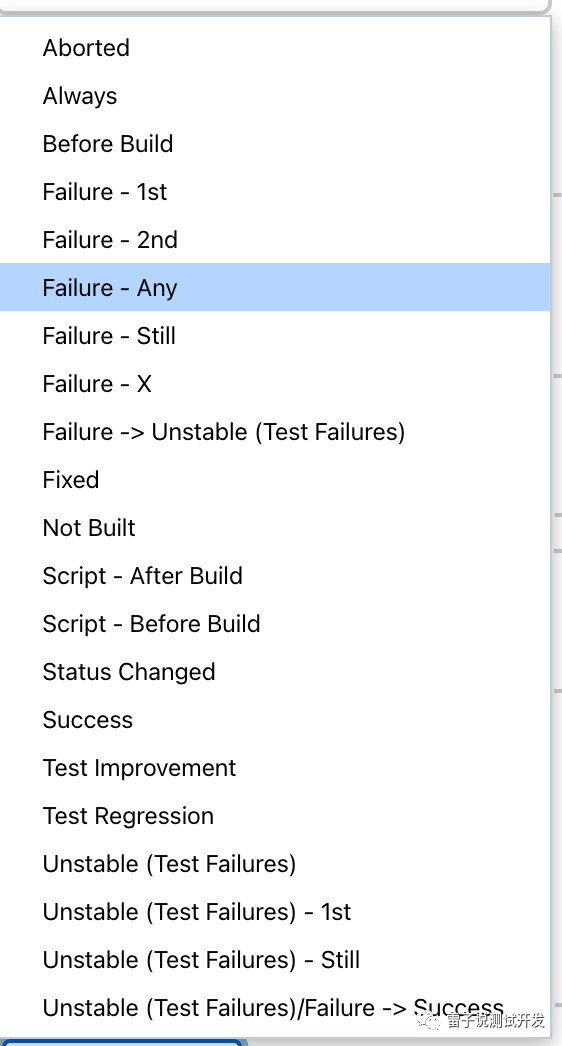 Success:如果构建的状态为”Successful”发送邮件。如果”Fixed”已配置,而上次构建的状态为“Failure”或“Unstable”,那么”Fixed”触发器将发送一封邮件来替代(它)。