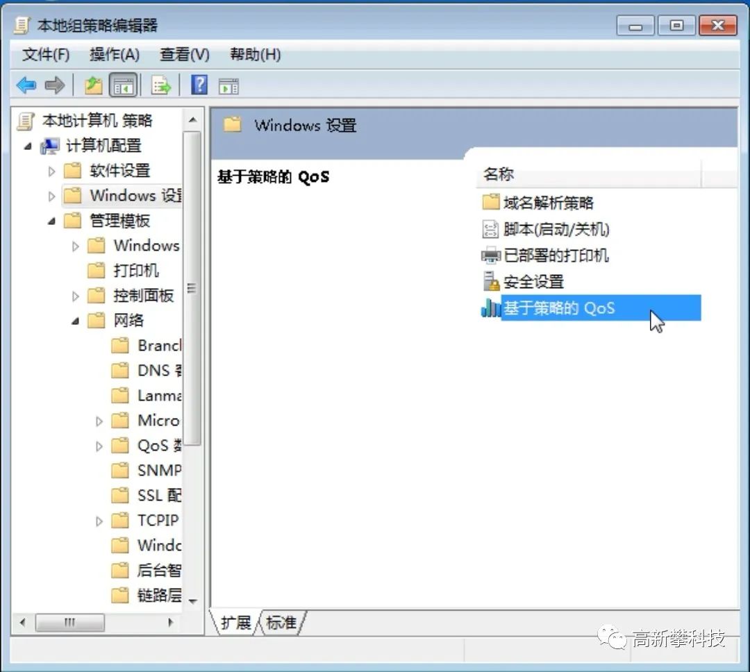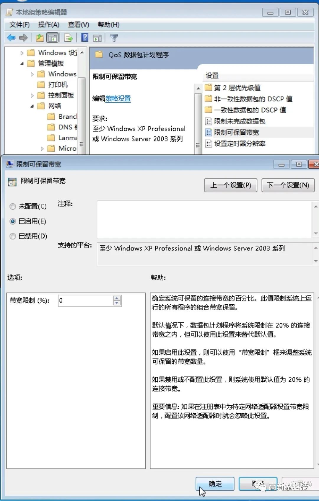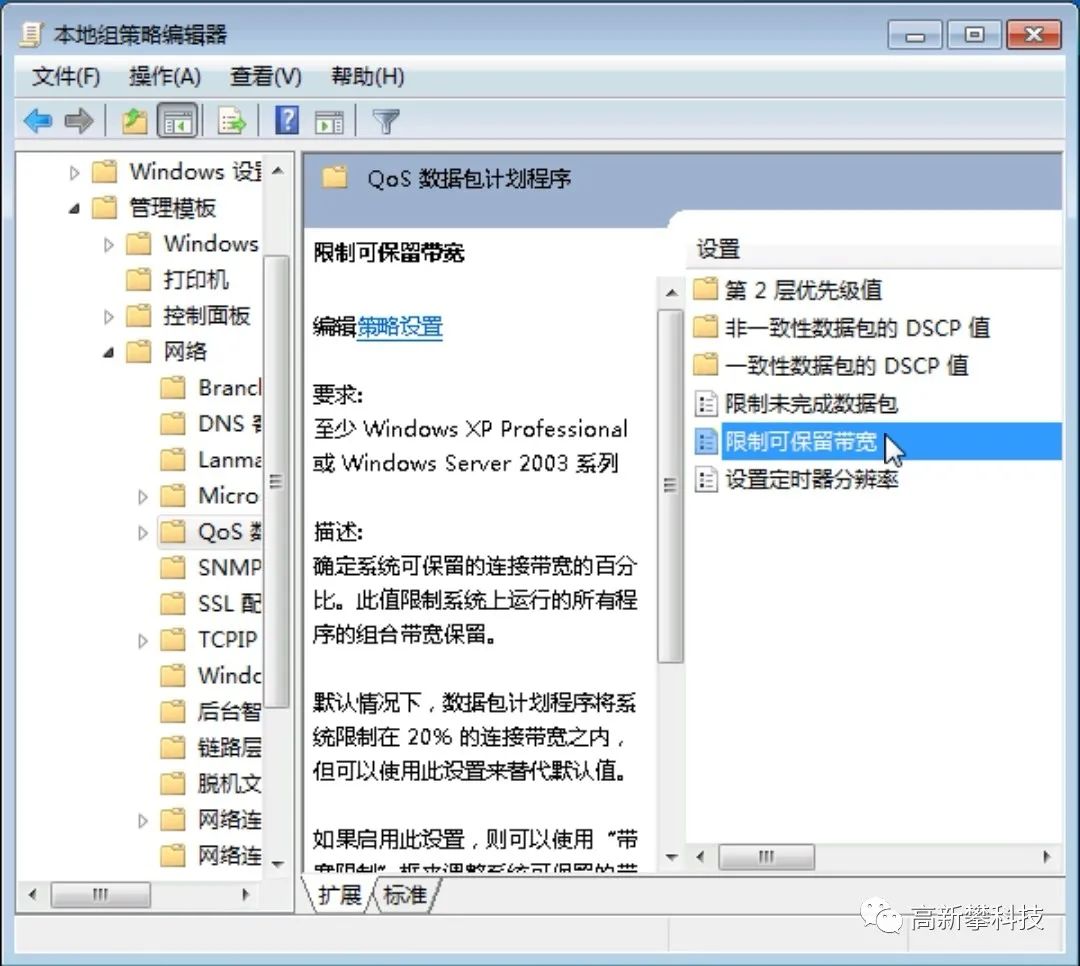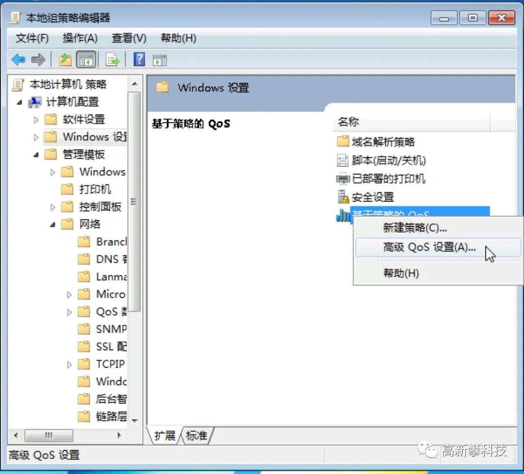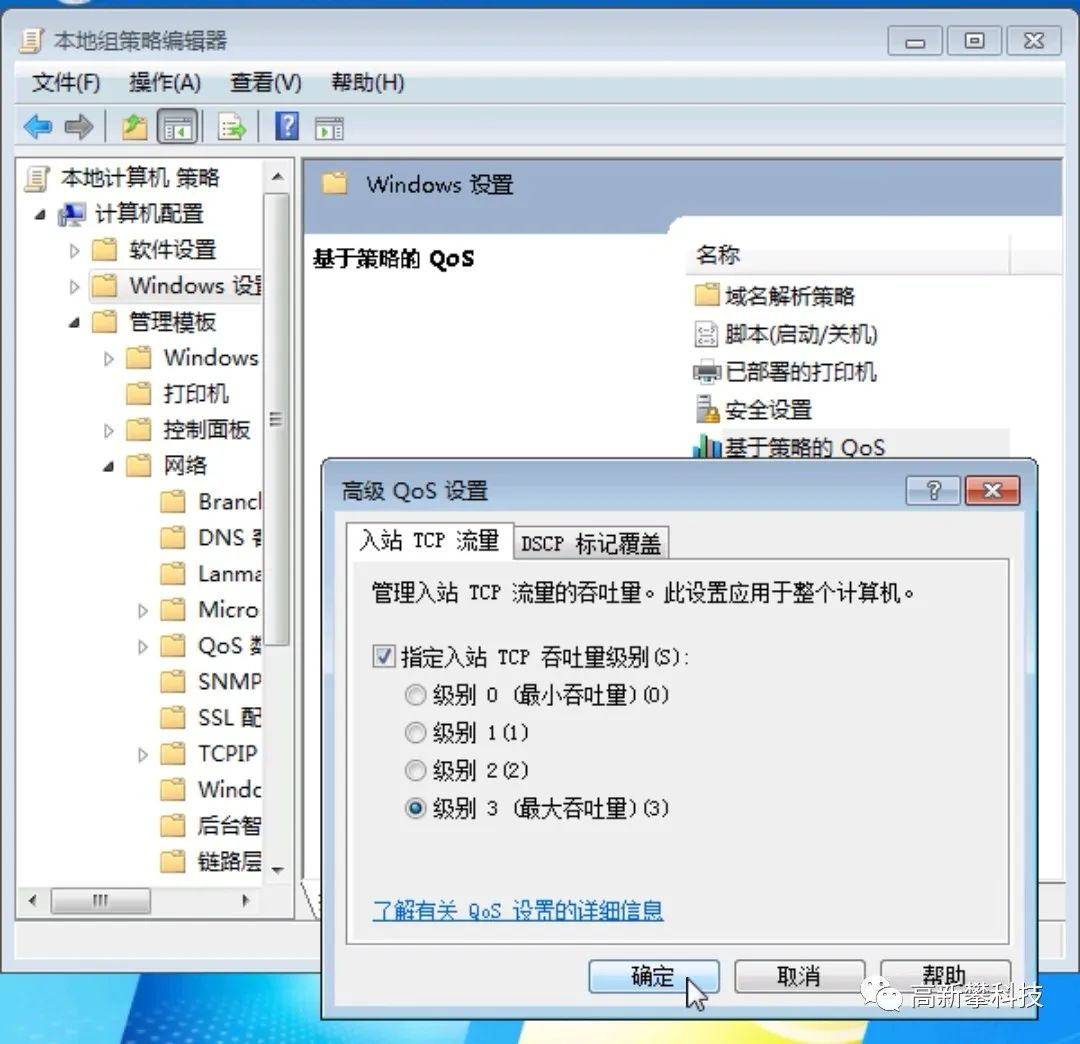 4.管理模板 Windows 5.基于策略的 QoS 点击左键选择高级 QoS 设置 选择打钩, 级别3最大吞吐,图片参考详情。