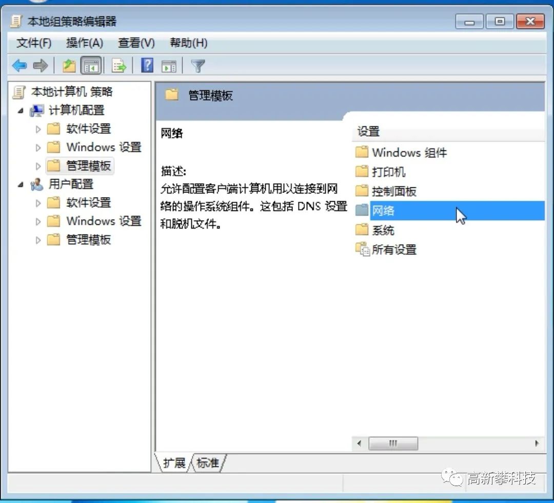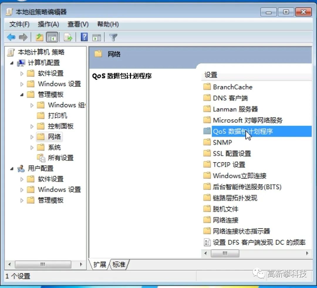 弹出本地组策略编辑器,选择计算机配置:管理模板,网络,QOS数据包计划程序!限制可保留宽带。Pop up the local group policy editor, and select computer configuration: management template, network, QOS packet scheduler! The broadband can be restricted.
