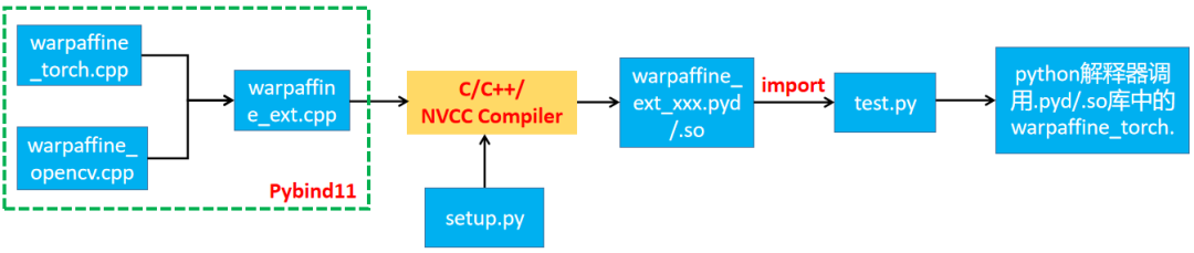 C++ 与 Python 或 PyTorch 的交互,业界主流做法是采用 pybind11,关于Pybind11 的更多详细说明可以参看文献 [15],其核心原理如下图所示: