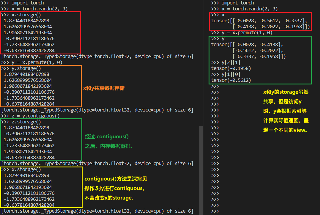 这是因为,不管是在 Python 还是在 C++ 代码中,使用 permute()、transpose()、view() 等方法操作返回一个新的 tensor 时,其与旧的 tensor 是共享数据存储,所以他们的 storage 不会发生变化,只是会重新返回一个新的 view,这样做的目的是减少数据拷贝,减少内存消耗,一定程度上加速网络训练或推理过程,如果在 Python 端对 tensor 做了 .contiguous() 操作,则在 C++ 端就不需要再做了,因为 .contiguous() 是一个深拷贝操作。