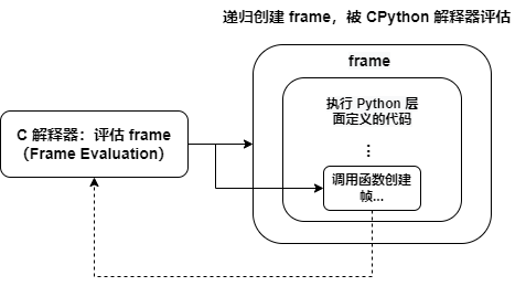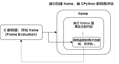事实上,我们很难在 Python 层面想到一种方法,将某一个修改(例如刚才提到的函数入栈时解析 frame)递归地作用在所有的函数栈上(函数入口及其内部调用的所有接口)。这件事看上去很简单,但是做起来却非常的困难,甚至早期的 CPython 都没有开放这样功能。因此 PEP 523 应运而生,再此之前,我们再回顾一下这张图: