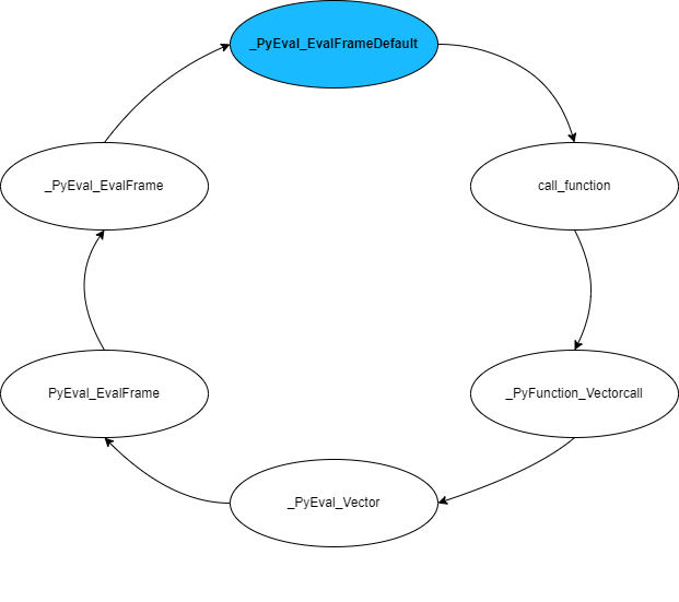 为了方便大家理解 Dynamo 是如何扩展 Frame evaluation 的,这里先给出 CPython 默认 Frame evaluation 的调用栈(以下代码片段摘自 Python 3.10,Python 3.11 对函数执行做了非常大的优化,以至于调用栈变得非常难懂):