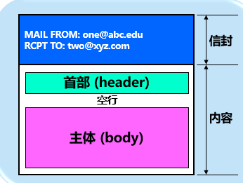 - 用户代理(UA):用户与电子邮件系统的接口,基本功能:撰写、显示、处理和通信