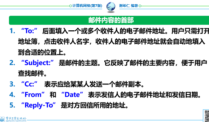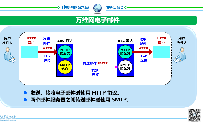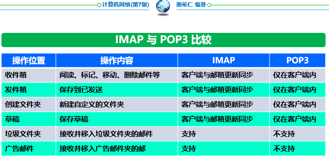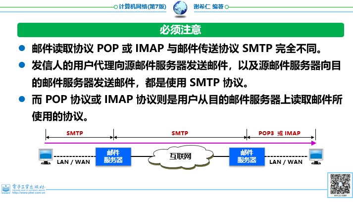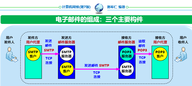 - 邮件发送和读取协议:简单邮件发送协议 SMTP:用于在用户代理向邮件服务器或邮件服务器之间发送邮件,邮局协议 POP3:用于用户代理从邮件服务器读取邮件。SMTP 和 POP3(或 IMAP)都是使用 TCP 连接来传送邮件的,目的是可靠地传送邮件