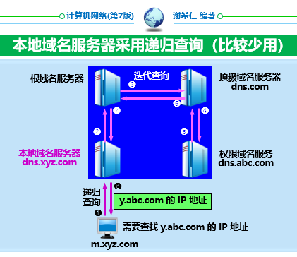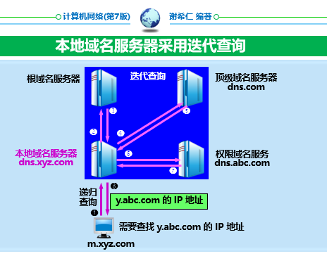 - 在使用迭代查询时,根域名服务器不把域名直接转换成 IP 地址,而是把下一步应当找的顶级域名服务器的 IP 地址告诉本地域名服务器