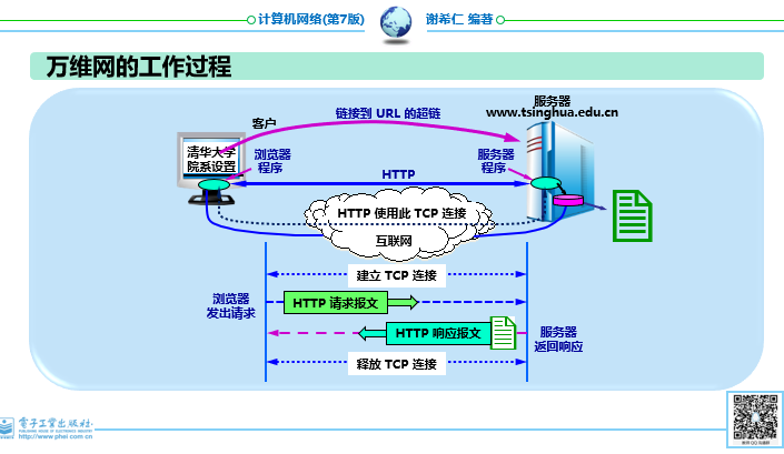 - 使用超文本传送协议 HTTP在万维网客户程序与万维网服务器程序之间进行交互。HTTP 是一个应用层协议,它使用 TCP 连接进行可靠的传送。