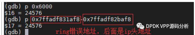 对上面代码中udp_header->checksum=0xefef,查询挂的地址中间2字节被修改成0xefef。到这里我们基本确认问题点。 但是疑问的为什么会修改到ring队列存储地址上? 经过计算确实偏移到了ring的地址上,报文长度是96字节,因为没有进行字节序转换,所以便宜量时0x6000,计算如下: (gdb) p &ring[idx] #异常mbuf的地址。 $8 = (void **) 0x7ffadf831af8。