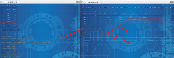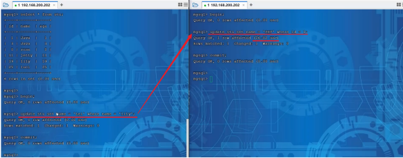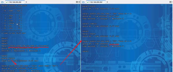 此时我们可以看到,客户端一,开启事务,然后依然是根据name进行更新。而客户端二,在更新id为3的数据时,更新成功,并未进入阻塞状态。这样就说明,我们根据索引字段进行更新操作,就可以避免行锁升级为表锁的情况。