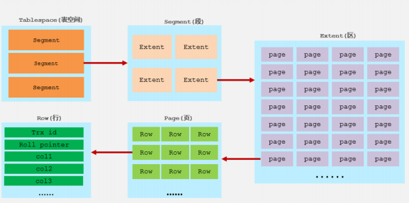 段,分为数据段(Leaf node segment)、索引段(Non-leaf node segment)、回滚段(Rollback segment),InnoDB是索引组织表,数据段就是B+树的叶子节点, 索引段即为B+树的非叶子节点。段用来管理多个Extent(区)。