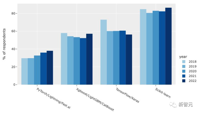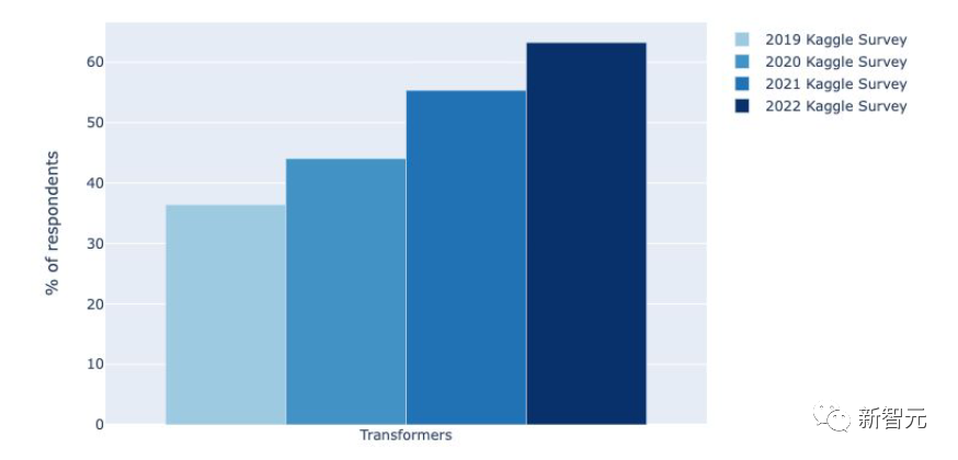 在深度学习架构的选择上,Transformers模型逐年上升,超过60%的数据科学家都在用。