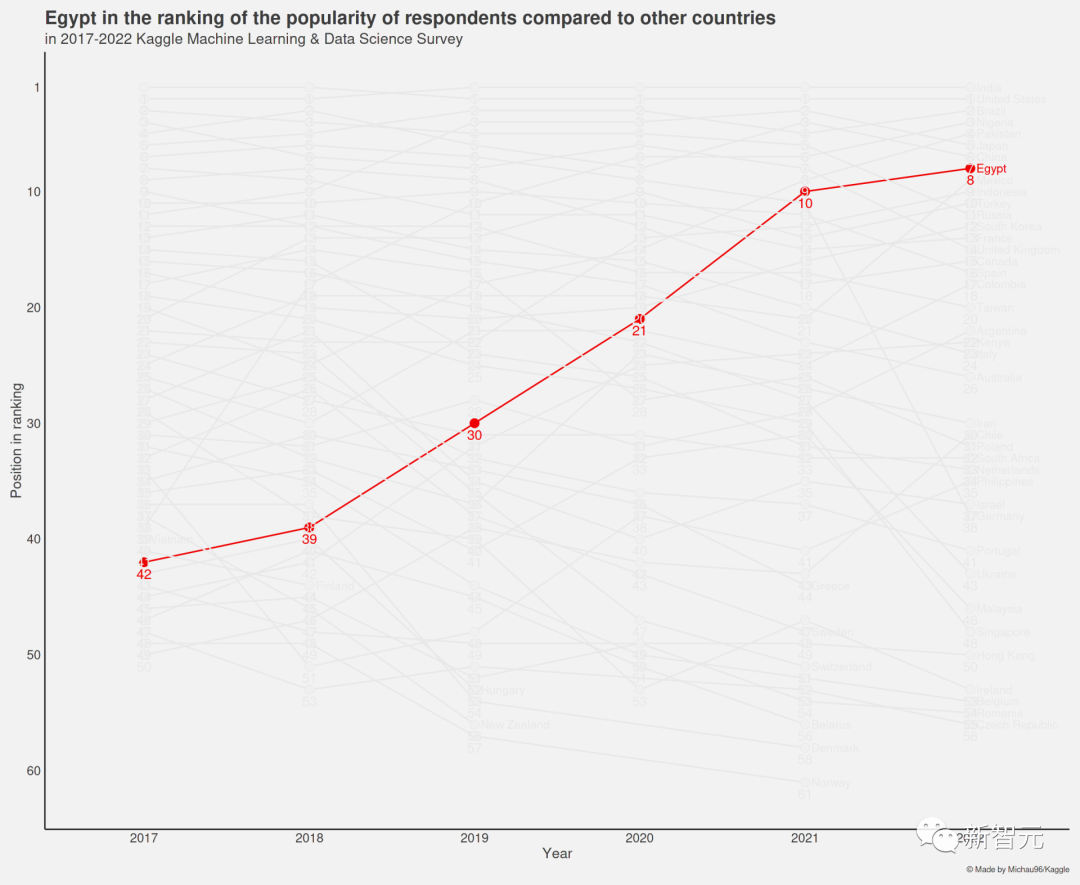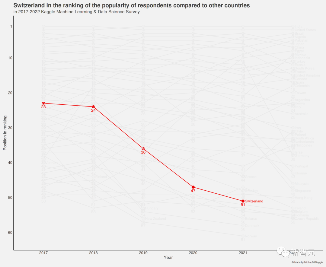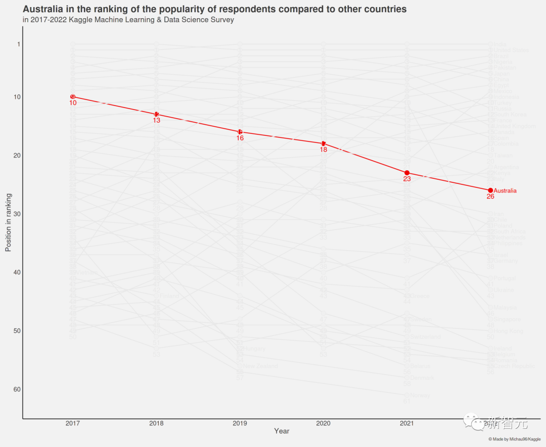 作者使用R语言,最后分析了50个地区,并根据其在Kaggle受欢迎程度的排名制作图表,最后分析的结果比如Kaggle在澳大利亚的受欢迎度连年下降。