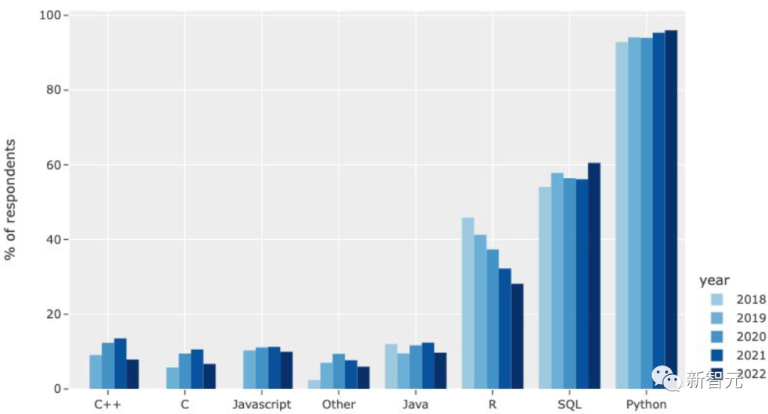在具体的编程实践上,Python和SQL仍然是两个最常用的语言,R语言的占比逐年下降,不过仍然排行第三。