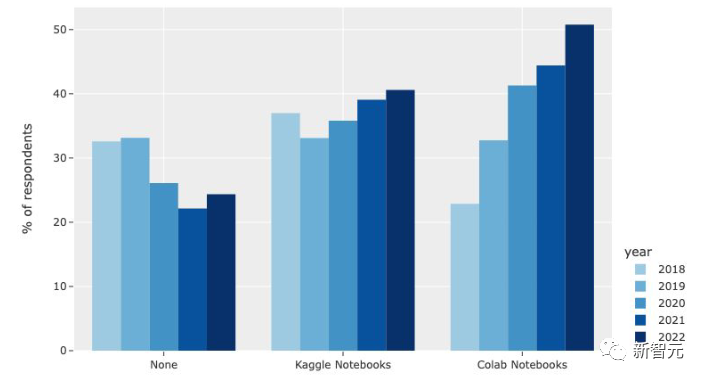在选择Jupyter notebook的云服务时,Colab的使用量连年攀升,超越Kaggle内置的环境成为最受欢迎的云Jupyter notebook