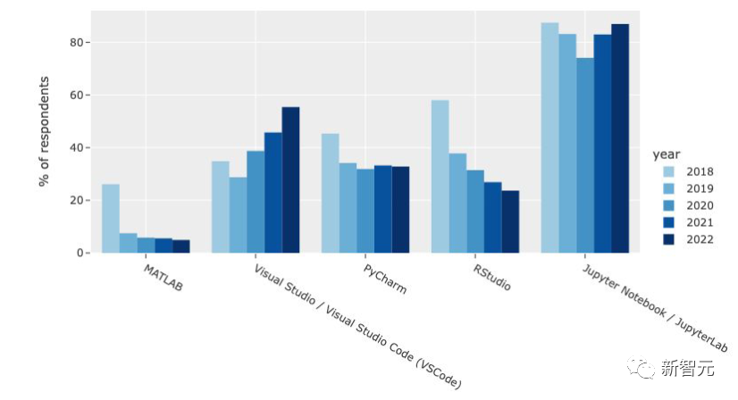 在IDE的选择上,有超过50%的数据科学家选择使用VS Code,超过80%的人都在使用Jupyter Notebook,而PyCharm和RStudio, MATLAB的市场份额丢得就有点惨了。
