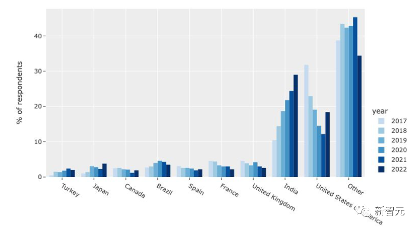 作者的主要工作内容为通过时间来查看每个国家/地区的受访者,该分析旨在在每个可能的国家/地区找到Kaggle的流行趋势,用到的数据集包括从2017年至2022年的Kaggle Machine Learning & Data Science Survey