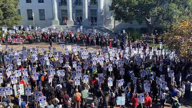 圣地亚哥分校和伯克利分校有数千名教职工参与抗议活动,因此学校的课程全部被打乱,研究工作全部被搁置,办公时间也被取消了。