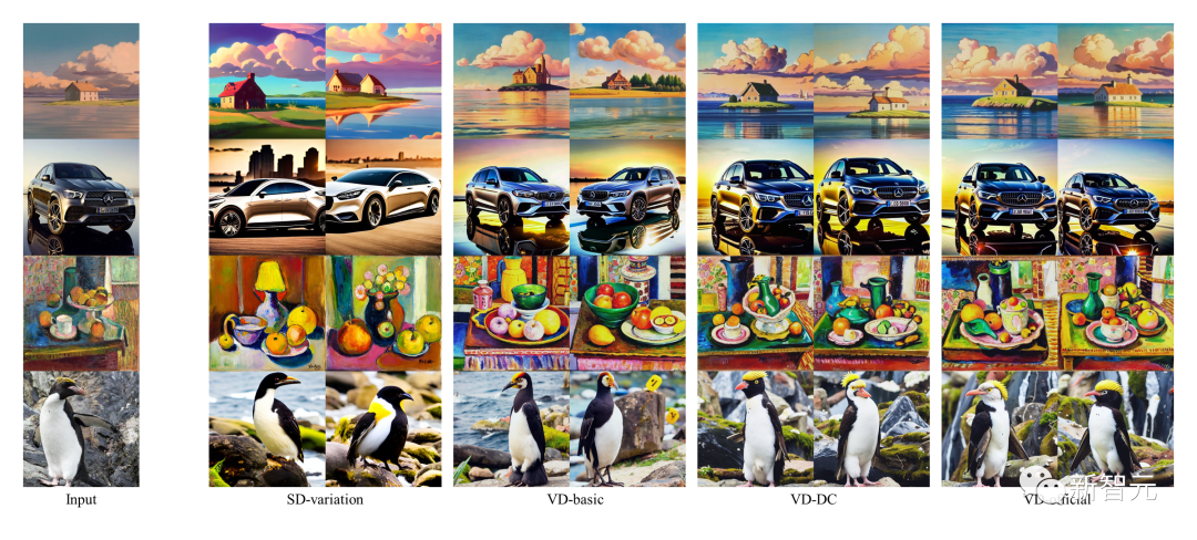 同时,作者还对不同的VD模型进行了定性比较,其中VDDC和VD-official用于文本到图像,所有三个模型用于图像变体。