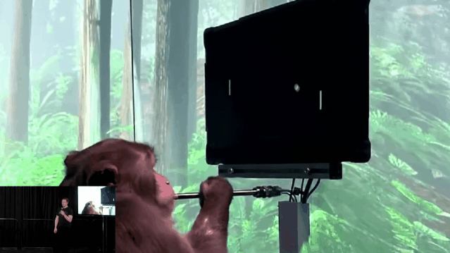 这次,马院士首先放了一段古早的视频,也就是我们熟知的猴子玩雅达利的经典游戏:「Pong」。