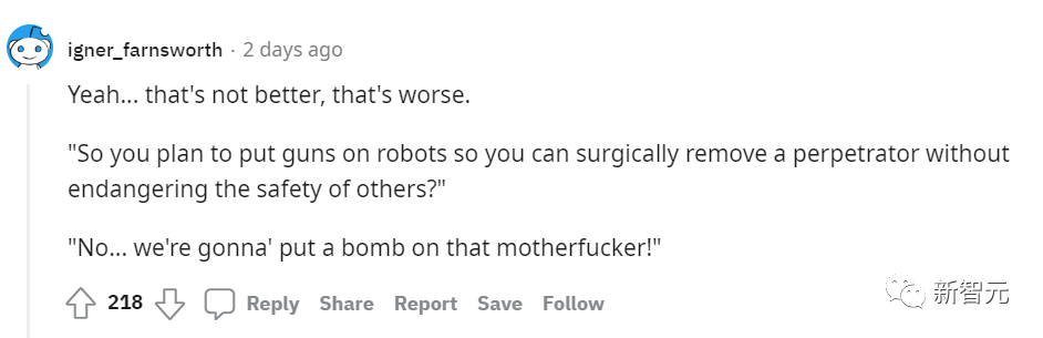 遥控机器人不会让治安变好,反而会把事情搞得更糟。 「所以你打算你打算给机器人配上手枪,让他们能够精确打击嫌犯而不危及旁人吗?」 「不,我们直接炸他丫的!」