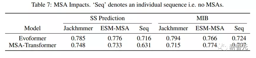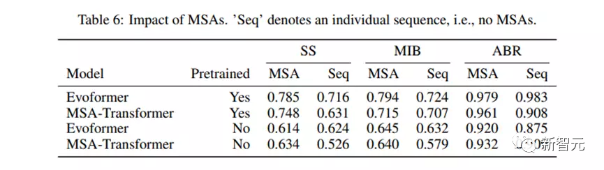 (4)在MIB和ABR两个功能预测任务上测试了MSA数量对于模型效果的影响,在失去MSA的情况下Evoformer和MSA-Transformer无论是否经过预训练,都会产生更差的功能预测结果。