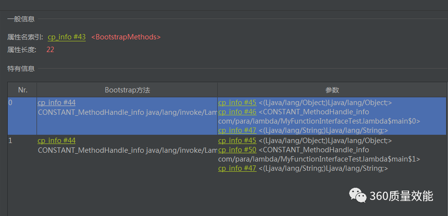 可以看到两个私有的静态方法干的就是Lambda表达式里面的内容,那么又是如何调用的生成的私有静态方法呢?如下图,通过分析main方法的L0,首先通过INVOKEDYNAMIC 指令调用是MyFunctionInterface的getValue方法的引用,以及后面的BootstrapMethods #0。使用jclasslib Bytecode viewer查看。