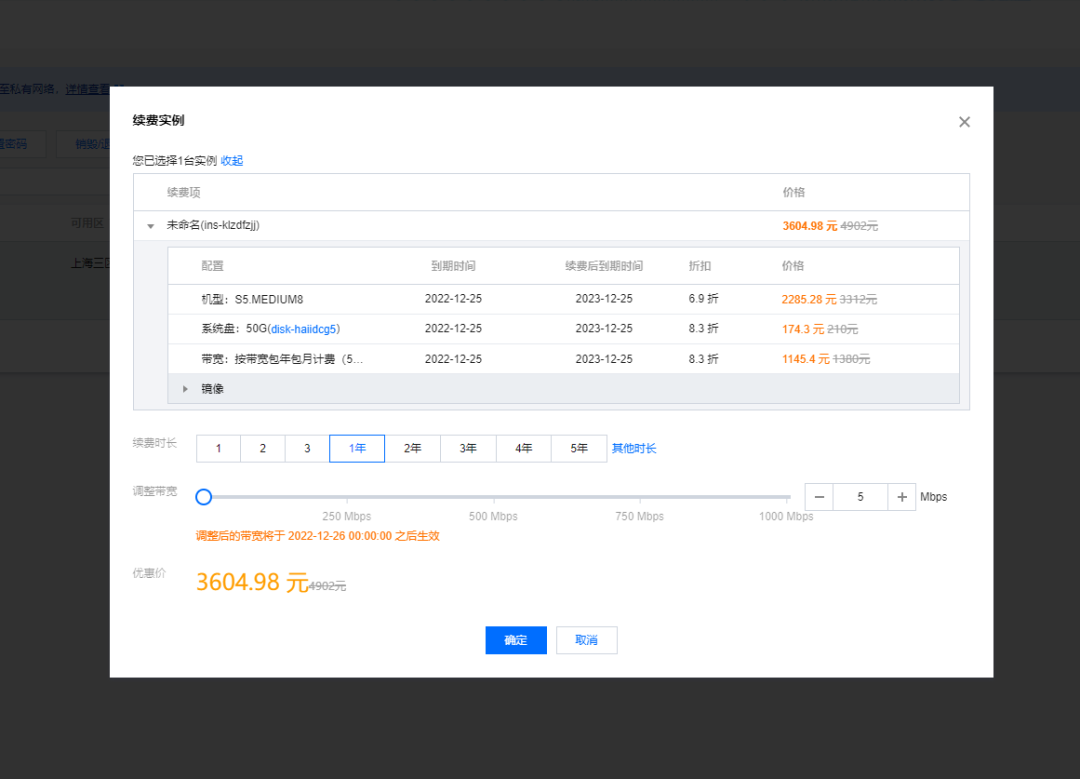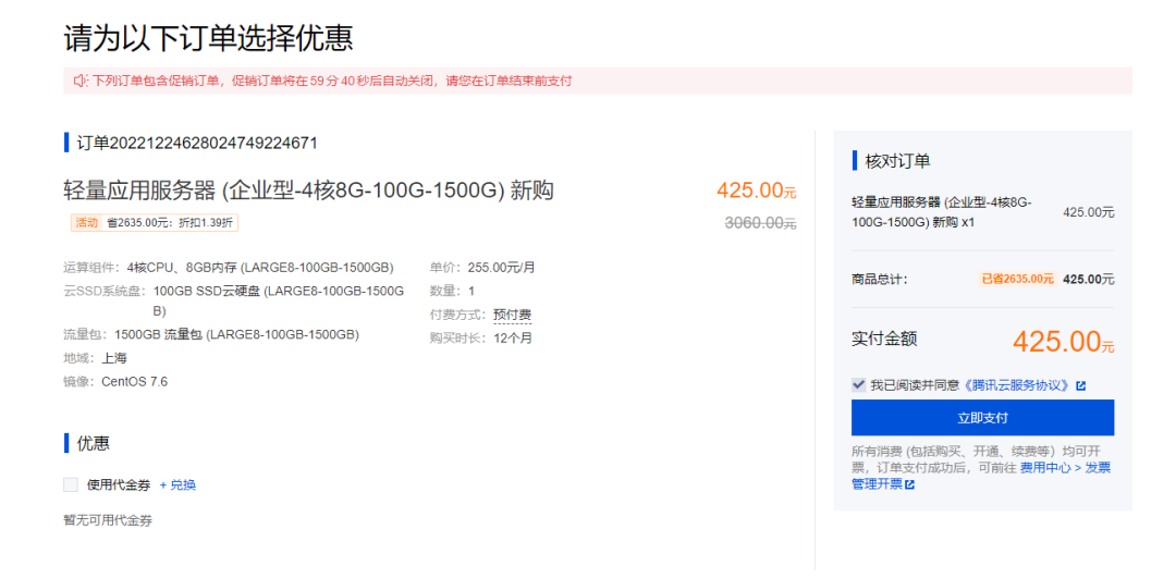 可以看到是企业型的4H8G-150G的硬盘,原价是3000,新用户400,这个优惠力度还是可以的,等明年继续找个新用户,毕竟是太贵了。