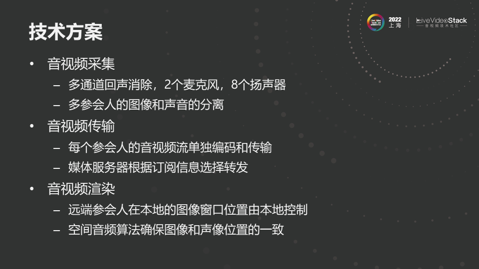 三是空间音频采集和回放与参会人具体数目和位置没有强关联,希望不像远真会议中只有几个固定位置。