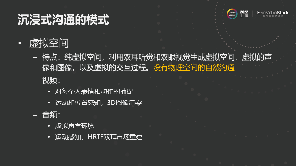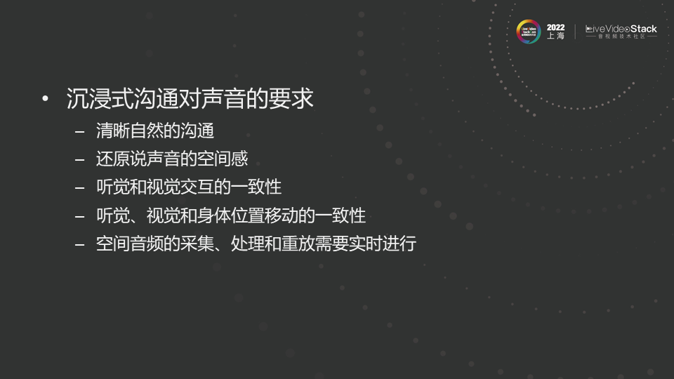 沉浸式沟通对声音要求是清晰自然的沟通;还原声音的空间感(方向和距离远近);听觉与视觉的一致性;听觉和视觉的变化和身体位置移动的一致性。其中最具挑战的空间音频的采集、处理和重放需要实时进行。这一点相对于看电影和听音乐有本质差别,在实现过程中带来很大挑战。